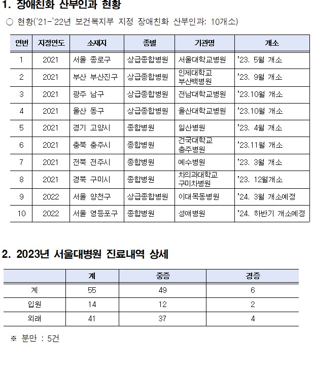 □ 서울시는 장애친화 산부인과를 확대하기 위해 추가로 ‘성애병원’을 지정 준비 중이며, 2023년 개소한 서울대병원을 포함해 총 3곳 운영을 목표로 추진하고 있다.