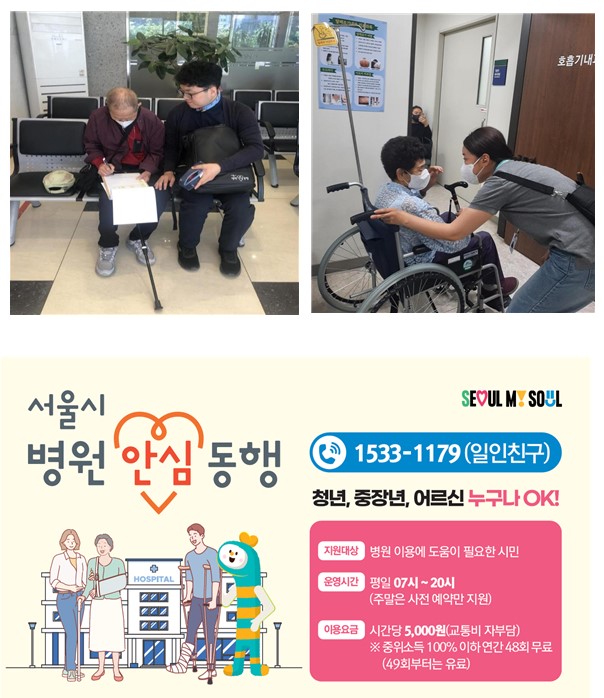 □ 병원안심동행서비스는 1대 1로 매칭된 동행매니저가 병원으로의 출발부터 귀가할 때까지의 전 과정을 함께하며 진료를 돕는 서비스다. 병원 이동은 물론 진료 접수, 수납, 약국까지 동행한다. 이 서비스는 1인가구뿐만 아니라 노인가구, 조손가정 등 가족구성원의 도움을 받기 힘든 서울시민 누구나 이용이 가능하다.