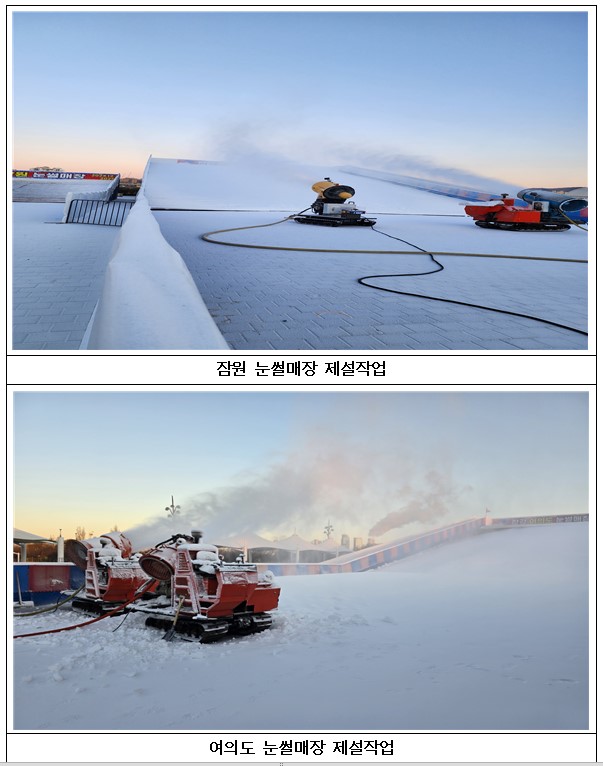 ○ 현재 제설작업은 약 50% 정도 진행되었으며, 기상 예보를 감안하여 12월 22일 제설작업을 완료하고 1일간 눈 정리 과정을 거쳐 12월 24일(화)에 눈썰매장 개장이 가능하다.