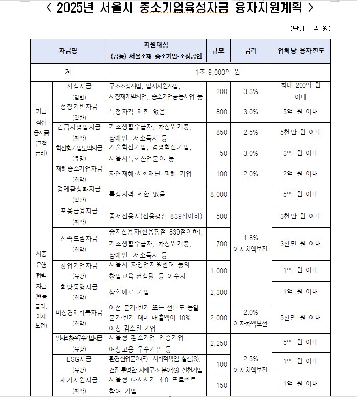 ○ 혁신형기업도약자금(50억 원): 기술혁신기업, 경영혁신기업, 서울시 특화산업분야 및 시책 사업 추진 기업 대상, 최대 3억 원, 고정금리 3.0%