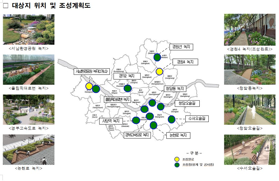 □ 시는 올해 11월 말까지 ▴서초구 올림픽대로변 녹지(4,500㎡) 및 경부고속도로변 부체도로 녹지(16,000㎡) ▴강서구 서남물재생센터 녹지(1,500㎡) ▴강남구 수서오솔길(12,000㎡) 등 10개소에 대규모 녹지를 확충할 예정이다.