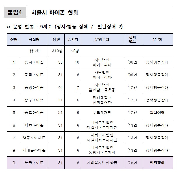 ․ 정서·행동장애 특화 아이존 : 송파(2006년), 동작(2009년), 중랑(2012년), 중구(2012년), 서초(2013년), 서대문(2013년), 영등포(2018년) ․ 발달장애 특화 아이존 : 종로(2012년), 동작(2025년) |