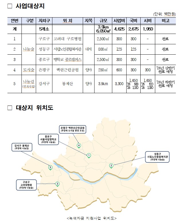 □ 한편 서울시는 동행가든 조성은 물론 기존 공원들의 접근성 개선을 위한 ‘나눔길’, ‘도시숲 환경 조성’도 함께 진행 중이다.