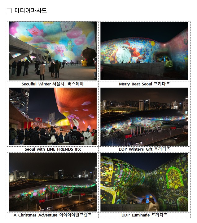 ○ 해치와 소울프렌즈, 라인프렌즈, 이야이야앤프렌즈 등 인기 캐릭터와 협업한 미디어파사드는 따뜻한 연말 정서를 더했고, ‘힙(HIP)산타’가 등장한 ‘Merry Beat Seoul’, ‘DDP Winter’s Gift’, ‘DDP Luminarie’는 DDP 전역을 하나의 크리스마스 타운으로 연결했다.