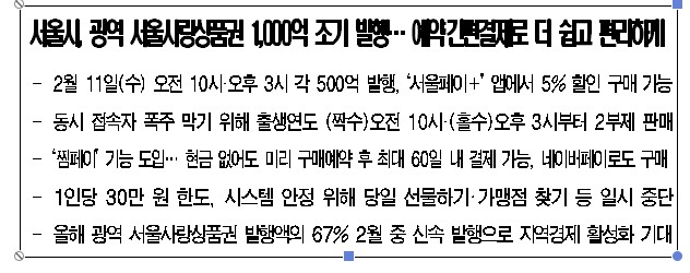 □ 서울시는 25개 자치구 어디에서나 사용할 수 있는 ‘광역 서울사랑상품권’의 올해 발행 예정액 1,500억 원 가운데 1,000억 원을 2월 11일(수)부터 5% 할인된 금액으로 조기 발행한다고 밝혔다.