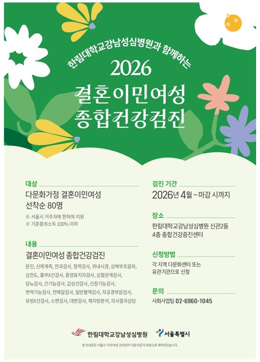□ 서울시는 한림대학교강남성심병원(병원장 이동진)과 협력하여 경제적 어려움을 겪는 결혼이민여성을 대상으로 ‘종합건강검진 서비스’를 시행한다. 지원 대상은 중위소득 100% 이하 가구이며, 올해는 총 80여 명을 선발해 지원할 예정이다.